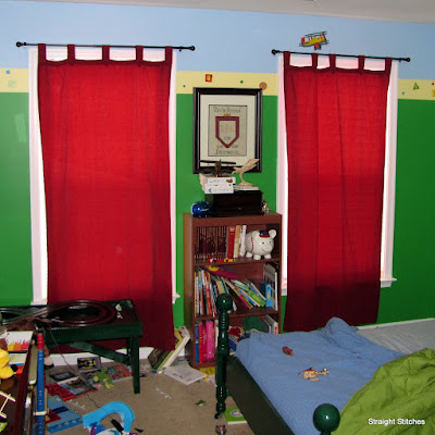 Oh yea...I changed his curtains completely. You see we were having an issue where H (and probably Dev) like to pull on them so the poor curtain rod was constantly having to be bent back up into place. Not to mention that the original red curtains are probably 3 years old and are faded beyond belief. It was time for a change.